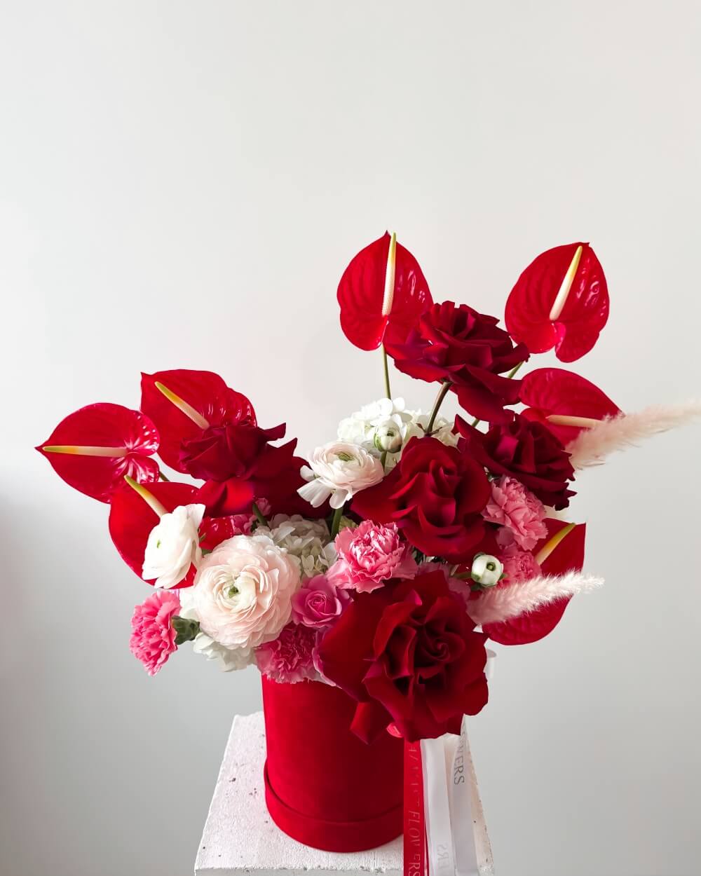 Pokud hledáte netradiční květinový dar, který zanechá silný dojem, tento box s anthurii a růžemi je tou pravou volbou.