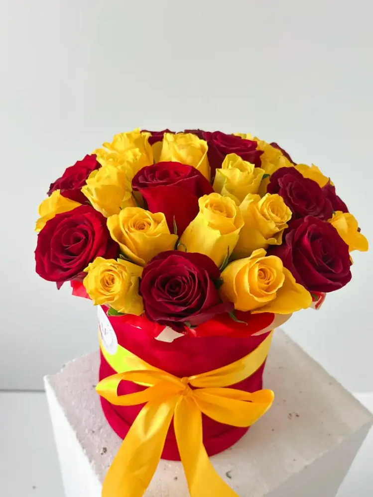 Máte chuť udělat někomu blízkému velkou radost? Představujeme vám náš červený květinový box s těmi nejkrásnějšími červenými a žlutými růžemi. Kytice v krabici, která okouzlí nejen svou krásou a elegancí, ale také nádhernou vůní. Tento jedinečný červený boxík je složen ze sytých žlutých a rudých růží, které přináší romanticku do vašeho života. Tento flower box není jen obyčejným dárkem, ale i uměleckým dílem, které vytváří harmonii a pohodu ve vašem domově. Každý detail je pečlivě promyšlen a vytvořen s láskou našimi zkušenými floristy.