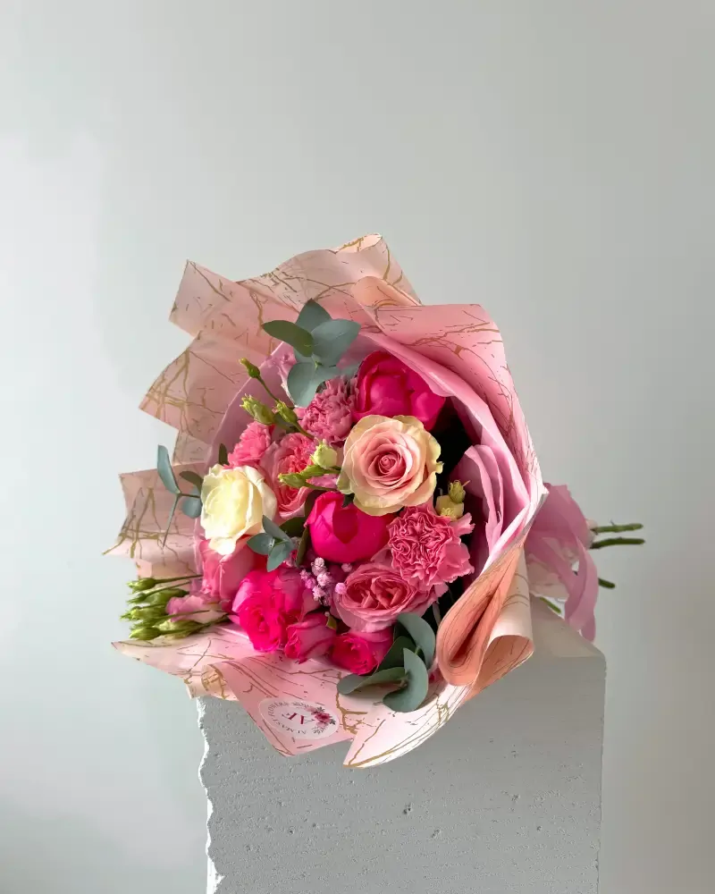 Její oblíbenákytice je kombinací různých druhů moderních barevných květin, převážně růžové a fialové barvy, doplněné o eukalyptus či gypsofilu. Tato kytice není jen obyčejným dárkem, ale i uměleckým dílem, které vytváří harmonii a pohodu ve vašem domově. Každý detail je pečlivě promyšlen a vytvořen s láskou našimi zkušenými floristy.