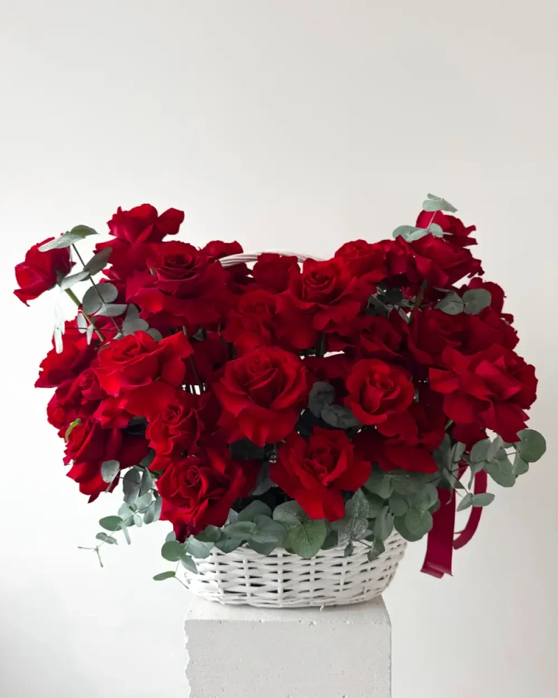Květinový koš s červenými francouzskými růžemiSkladem5 299 Kč/ ks