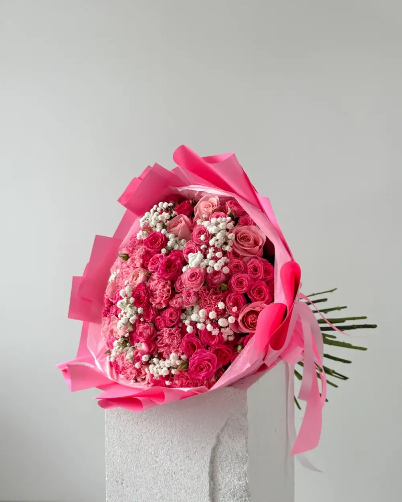 Odstíny růžové se střídají v harmonickém celku. Kytice je navíc zabalená naším stylovým způsobem a doplněna saténovou stuhou pro ještě luxusnější dojem. Tato kytice je ideálním řešením pro váš dárkový problém – ukazuje váš vkus, péči a lásku ke své milované osobě.
