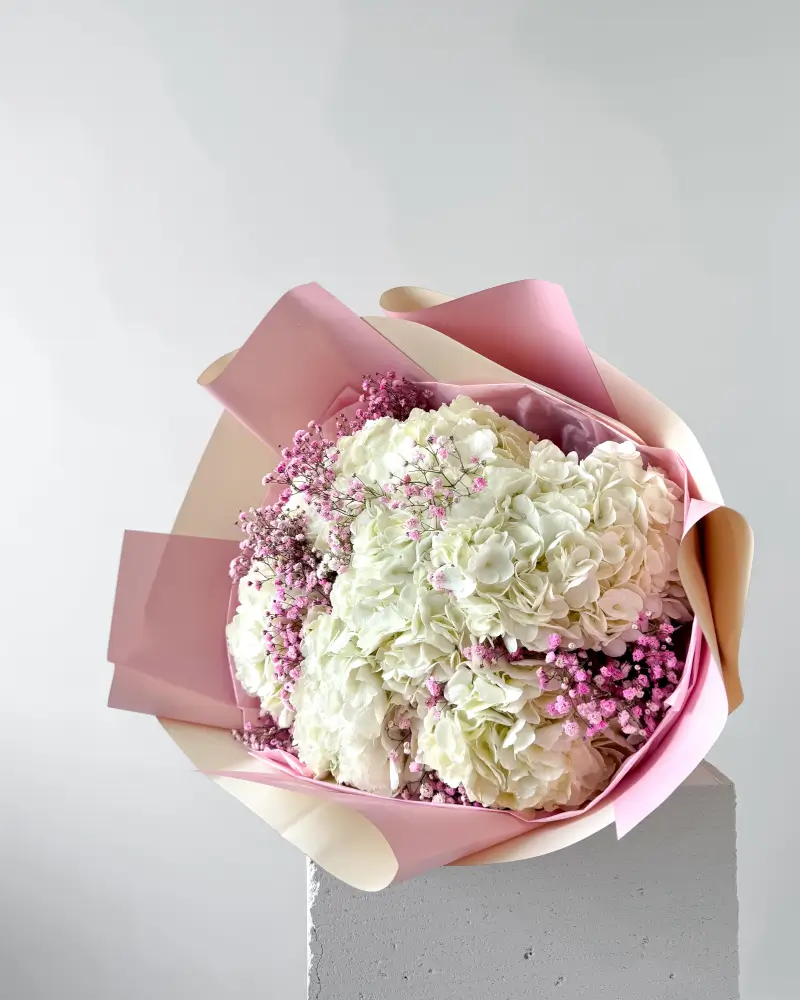 Kytice bílých hortenzií s růžovou gypsofilouSkladem2 900 Kč/ ks