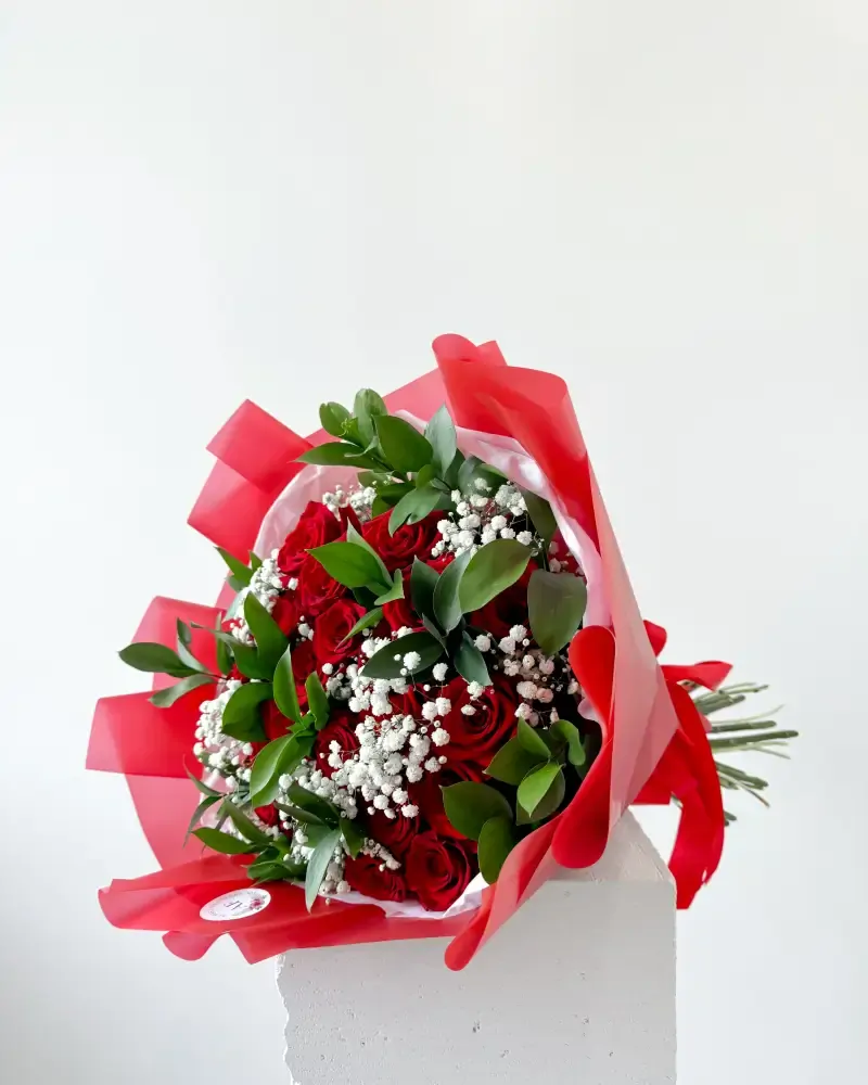 Zamilované srdce touží po kráse a romantice, a co by mohlo být romantičtějšího než kytice červených růží? Tyto nádherné květiny symbolizují lásku, vášeň a oddanost. Tato kytice z růží však není jen tak obyčejná, je navíc doplněna o bílý nevěstin závoj a svěží ruscus, který dodává celé kompozici unikátní nádech čerstvosti a elegance.