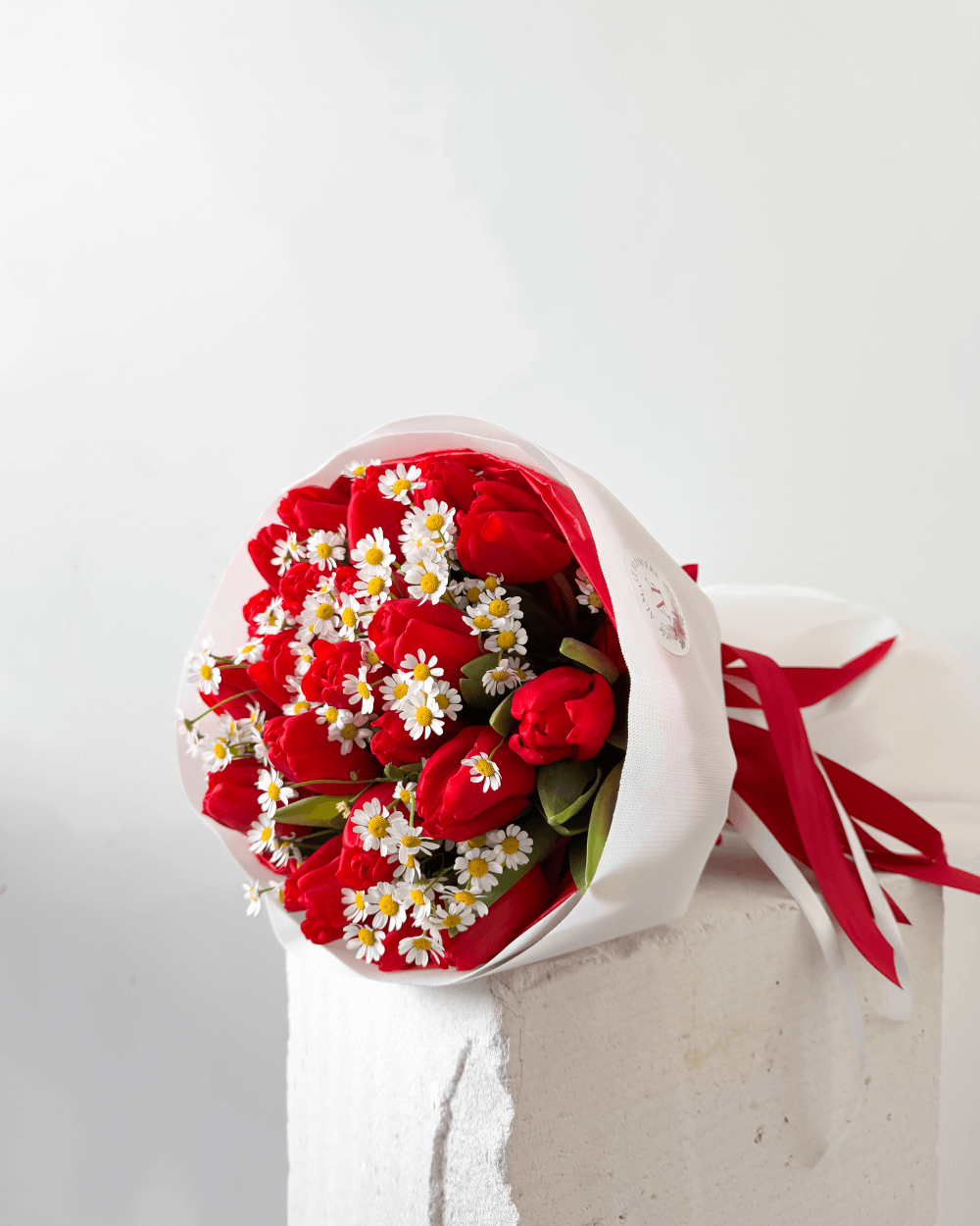 Kytice červených tulipánů s heřmánkem spojuje eleganci s přirozenou jarní lehkostí. Sytě červené tulipány přinášejí do kytice výraznou barvu a symboliku lásky, vášně a hlubokých emocí. Jejich výrazné květy krásně kontrastují s drobnými kvítky heřmánku, který celé aranžmá zjemňuje a dodává mu romantický, téměř luční charakter.