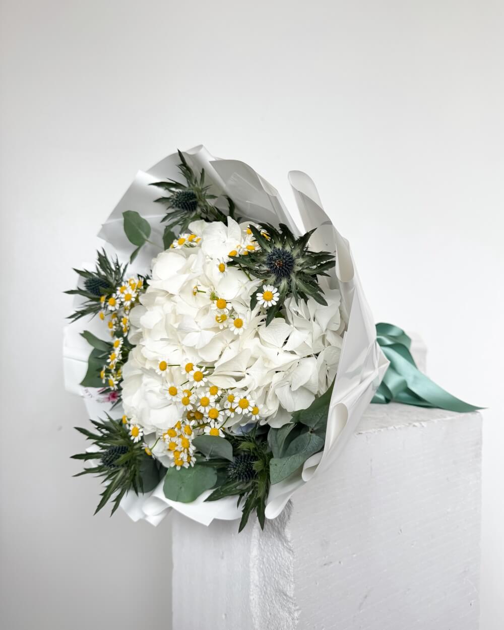 Kytice s bílými hortenziemi a heřmánkem je jedinečné spojení elegance a přírodní lehkosti. Dominantní bílé hortenzie působí slavnostně a luxusně, zatímco drobné kvítky heřmánku dodávají aranžmá jemnost a hravost. Modré bodláky a eukalyptus podtrhují svěží kontrast a vytvářejí originální, moderní kompozici.