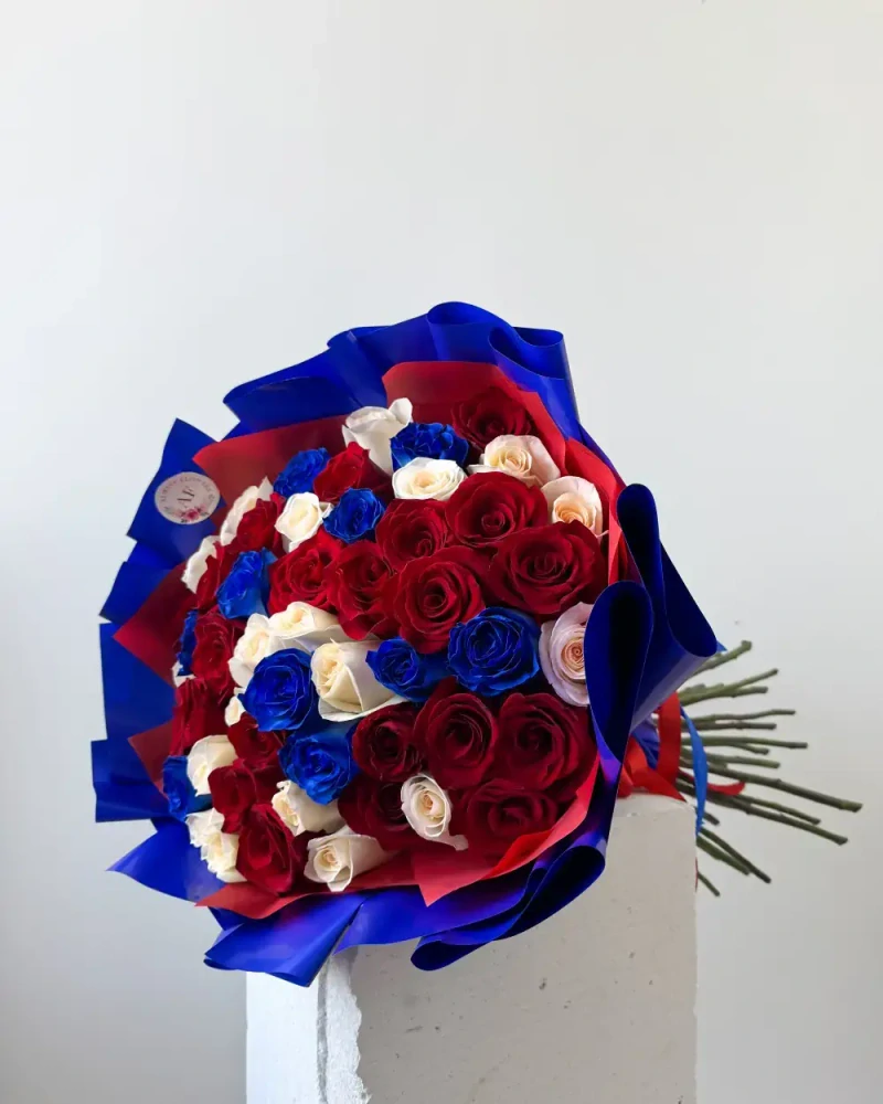 Překvapte touto neuvěřitelnou kyticí z modrých, červených a bílých růží!
