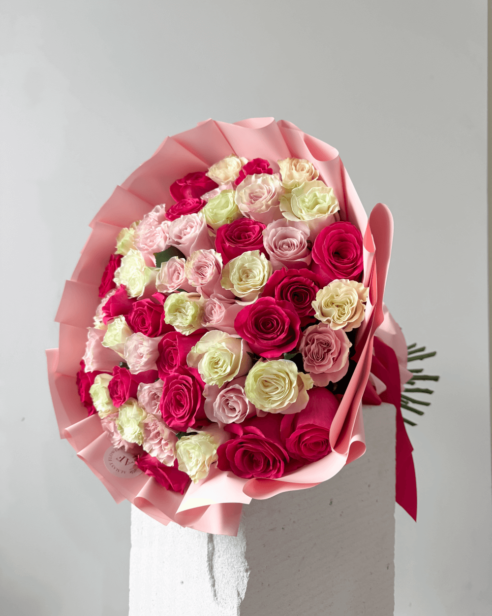 Kytice růžových a bílých růží je luxusně zabalená ve světlém ozdobném papíru, který podtrhuje jejich krásu a eleganci. Naše firemní logo na samolepce dodává exkluzivitu a prestiž, zatímco saténová stuha dodává dokonalý dotek. Tento dárek je ideální pro všechny příležitosti - narozeniny, výročí, svatby nebo jen tak, abyste ukázali, jak moc si vážíte svých blízkých.