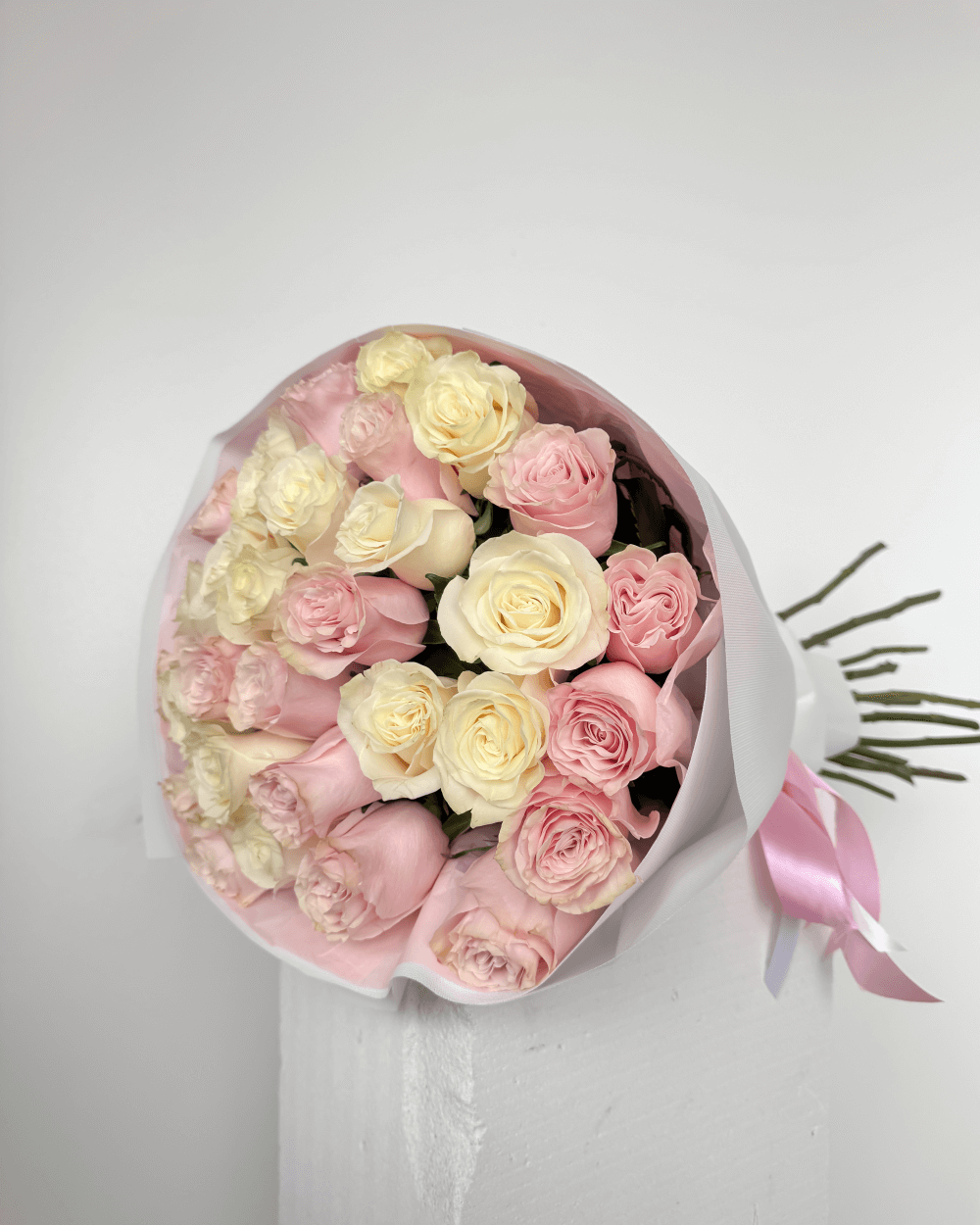 Tato elegantní kytice v pastelových odstínech růžové a bílé je symbolem něhy, čistoty a upřímných emocí. Kombinace čerstvých růží vytváří harmonický a luxusní dojem – perfektní volba pro výročí, narozeniny, žádost o ruku nebo jako dárek, který potěší „jen tak“.