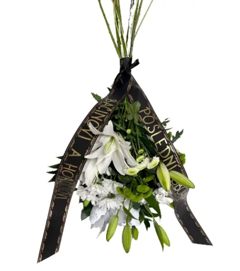 Vzkaz na smuteční stuhu uvedeme dle vašeho přání ZDARMA. V poznámce u dodacích údajů nám napište, co si budete přát na stuhu napsat. Tato kytice je symbolem vzpomínky, klidu a respektu vůči ztrátě a zanechává dojem, který jde hluboko pod povrch. Bílé lilie, které dominují této smuteční kytici, symbo... celý popis