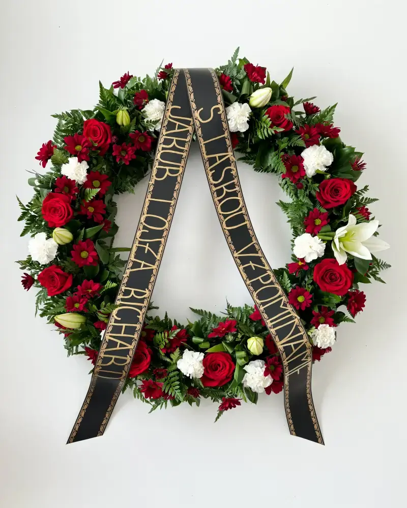 Smuteční věnec z bílých lilií a červených růží, doplněný o chryzantémy a karafiáty. Věnec na pohřeb přináší s sebou pocit klidu a důstojnosti. Jeho prostá elegance a tichá krása mluví za všechny slova. Dovolte, aby tento věnec byl vaším poselstvím lásky, respektu a vzpomínky na vaše milované.