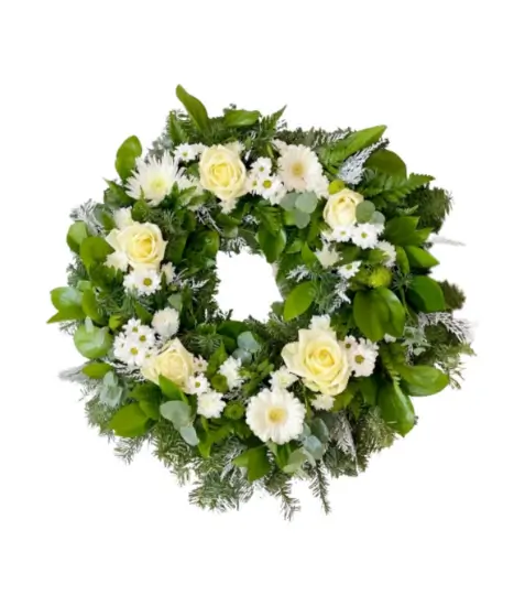 Náš smuteční věnec je složen z čerstvých bílých růží, chryzatném a karafiátů a čerstvé zeleně. Můžete si tak být jisti, že tento věnec bude při posledním rozloučení působit stejně krásný jako ve chvíli, kdy jej obdržíte.