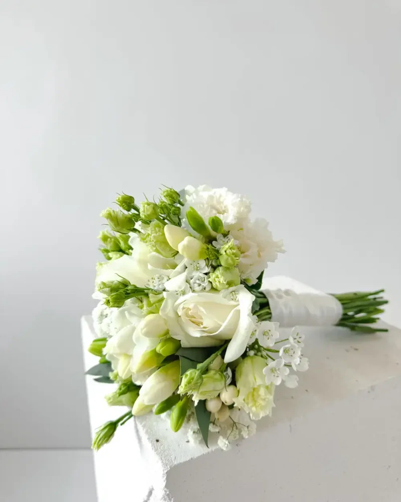 Kytice je laděna do čistě bílé barvy s lehkým nádechem do zelené a krémové barvy. Kytice obsahuje růže, frézie, eustomy, gypsofilu a sezónní květiny dle aktuální nabídky.