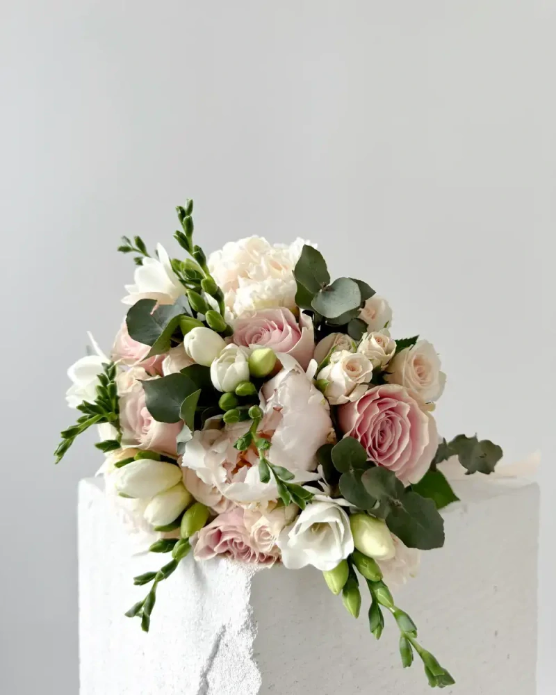 Představujeme vám naši exkluzivní svatební kytici z komabinace sezónních květin v krémových, lehce narůžovělých tońech. Kytice ztělesňuje dokonalost a romantiku vašeho nejvýznamnějšího dne. Tato kytice je stvořena pro vás, abyste se cítila jako princezna a vytvořila si nezapomenutelné vzpomínky na váš svatební den.