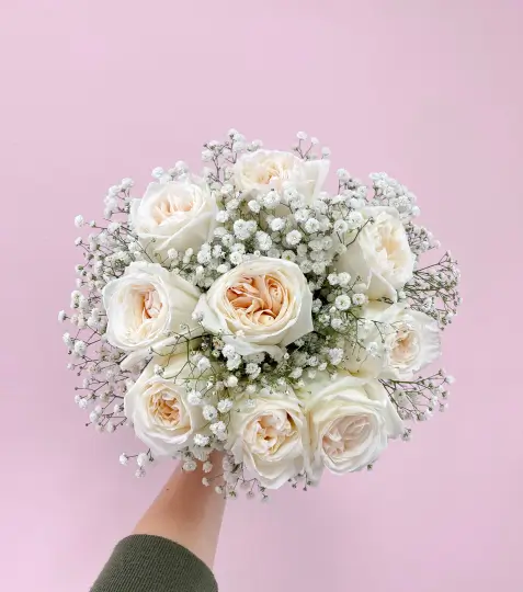 Bílé růže jsou tradiční volbou pro svatby, protože vyjadřují čistotu a nový začátek. Jsou symbolem nevinnosti a dokonalé lásky mezi novomanžely. Nabízíme volbu pivoňkových růží, které jsou ještě krásnější a dodají vašemu dni ještě větší dojem! Gypsofila, známá také jako "nevěstin závoj", dodává kytici jemnost a romantiku. Je to jako obláček jemných bílých květů, který tvoří harmonický doplněk k hlavnímu prvku - růžím.