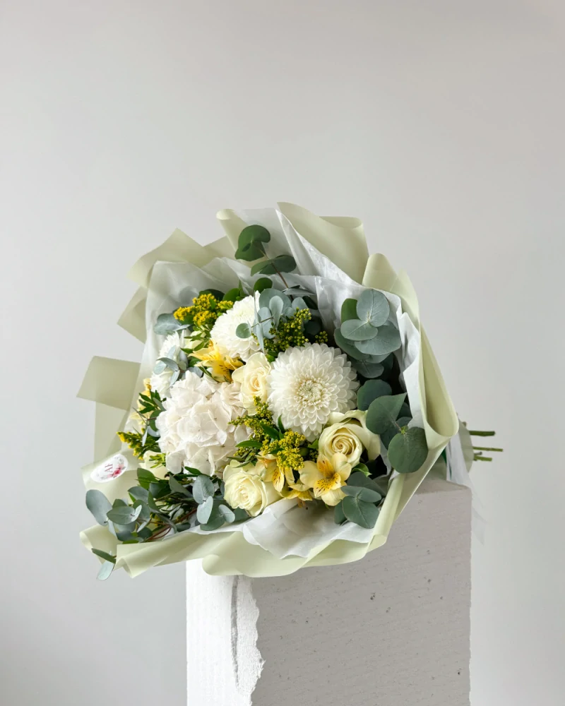 Bílo zelená kytice čerstvých květin je elegantní a svěží kombinací květin, která přináší jemnost a čistotu. Ideální pro každou příležitost, tato kytice spojuje čistotu bílých květů s přírodní zelení, čímž vytváří harmonický a svěží vzhled.